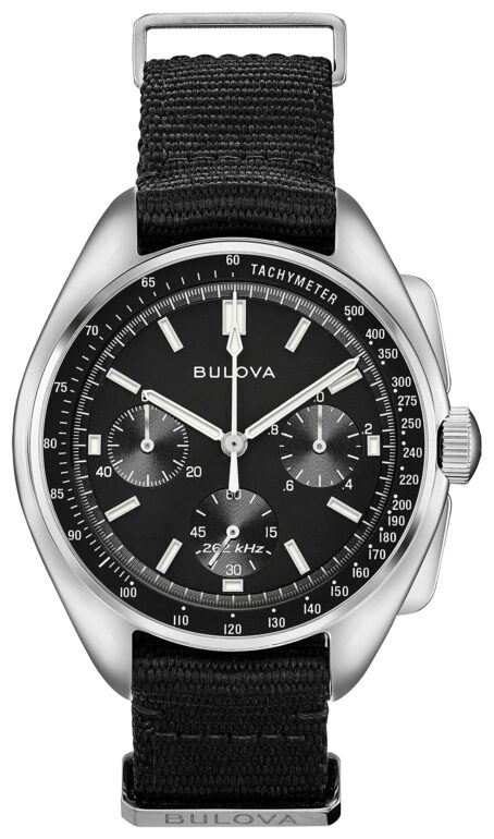 Bulova メンズ アーカイブシリーズ Lunar Pilot 6針クロノグラフ 高性能クォーツステンレススチール ブラックNATOストラップとサファイアクリスタル スタイル:96A225, Bulova。, クロノグラフ。