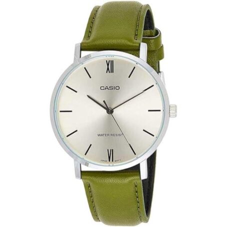 Casio MTP-VT01L-3B Men’s Minimalistic Silver Dial Green Leather Band Analog Watch
